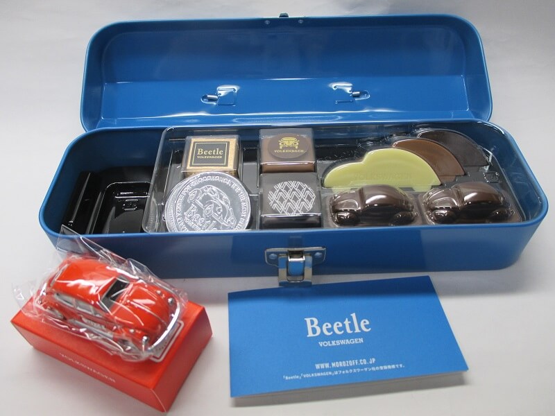 チョコ詰め合わせと限定デザインのミニチュアカーが入っています
